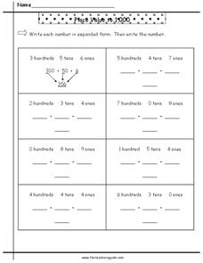 In this place value worksheet, students write a set of numbers given in expanded form. A website reference for additional resources is given.