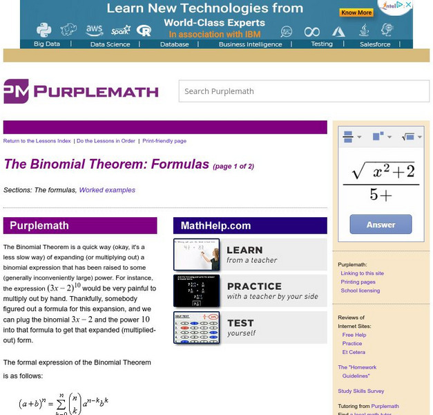 The Binomial Theorem is a process of expanding a binomial that is being raised to a large power. All steps needed to perform the process on a graphing calculator are listed. The concepts of factorials and Pascal's Triangle -- both key to...