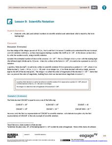 Young mathematicians learn how scientific notation is meant to save time. Part 10, out of a series of 15, asks scholars to recognize the correct use of scientific notation and finish by adding and subtracting numbers using...