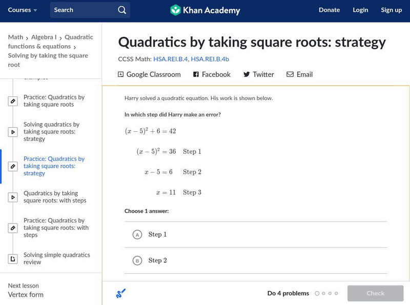 Analyze the process of solving a quadratic equation by taking the square root. Students receive immediate feedback and have the opportunity to try questions repeatedly, watch a video or receive hints.