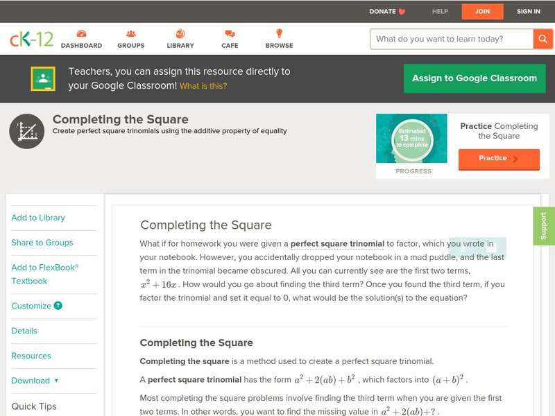 [Free Registration/Login may be required to access all resource tools.] Learn how to complete the square in order to solve quadratic equations.