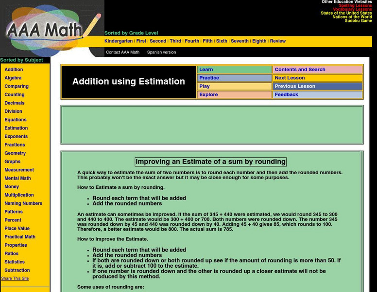 This site explains how to estimate sums by rounding whole numbers. Games and exercises are provided to practice the skill.