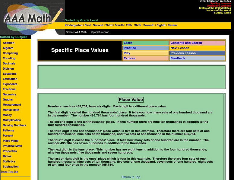 This site explains the place value of six digit whole numbers. It provides games and exercises to practice the skill.