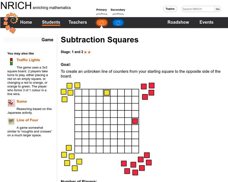 Use this game to improve your subtraction skills. You will not only need to know your subtraction facts you will also need to figure out a strategy to win! There is a "Get Printable Page," link at the top if you want to print it out to...