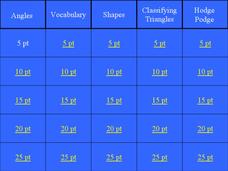 This geometry PowerPoint engages students in a Jeopardy game that reviews geometry concepts. In this PowerPoint, students review concepts such as angles, shapes and triangles and solve the question for the most points.