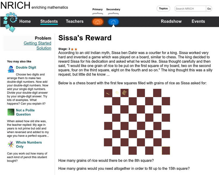On this one page website use a table to help you solve this problem about the chess board and grains of rice. The solution is available right on the website.