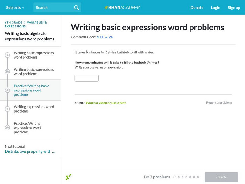 Practice writing basic expressions from word problems. Students are able to check their answers, view a solution, or watch a video for assistance.
