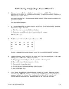 In this problem solving strategies worksheet, students solve and complete 5 different word problems that include logic and the process of elimination. First, they determine the number of questions asked to determine a selected number....