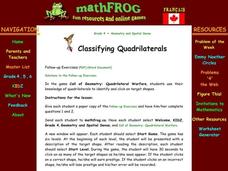 Fourth graders select the Quadrilateral Quest game, they find all quadrilaterals with the given properties. They are told that the word congruent in this game means equal. Students are given two to four properties of quadrilaterals. ...