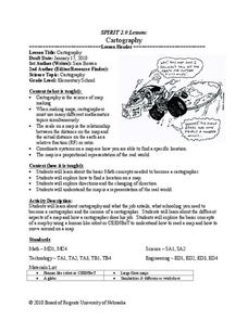 Students research about cartography and how to be a cartographer. In this math lesson, students draw a map of their classroom. They use a robot to explore navigation using a compass rose.