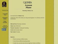Students practice how to calculate volume using mummy cases. They measure using ancient Egyptian, U.S., and metric systems. They explore how to convert measurements into different systems, and discuss ratios.
