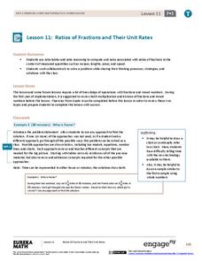 Challenge the class to calculate unit rates using complex fractions. Pupils work through examples of finding unit rates using ratios of fractions. To complete the 11th lesson plan of 22, scholars review sample work and determine whether...