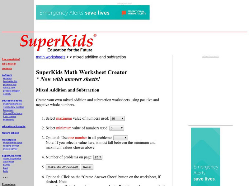 Create your own addition/subtraction math facts worksheets. Use them in the classroom for practice or timed drills, or at home! Choose from two levels of difficulty, and vertical or horizontal equation format. You input minimum and...