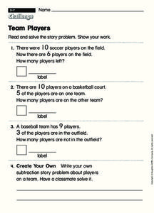 In this math word problem practice worksheet, students sharpen their skills as they read and solve 3 subtraction story problems. Students also write a subtraction story problem of their own.