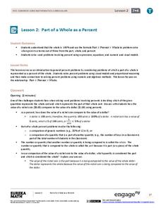 Pupils use visual models, numeric methods, and equations to solve percent problems. To complete the second installment of 20, they find the part given the percent and the whole, find the percent given the part and the whole, and find the...