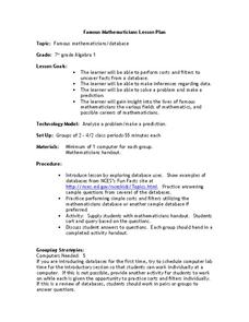 Learners analyze a math database and uncover facts. In this algebra activity, students investigate the lives of famous mathematicians using facts they find about the different authors. They gain a new perspective for the...