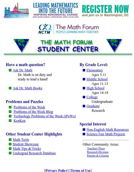 The Math Forum Student Center provides math news, notes, challenges, and much more. Dr. Math is here with the answers to students' math questions. There's a teachers' section, a research division, and a parents' part. This site also...