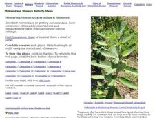 In this milkweed and monarch butterfly mania: measuring worksheet, students use photos of milkweed plants and caterpillars next to a ruler to estimate the measurements of 10 leaves and 15 caterpillars, calculating and recording...