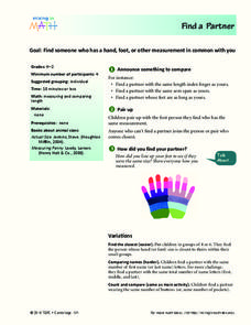 Students find a partner with the same finger, arm and foot span as they have. For this nonstandard measurement lesson, students compare the length of their index finger, arm and feet. Students who don't match anyone find the...