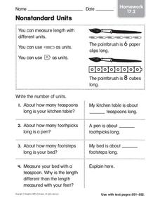 Here is a very good measurement activity. Four problems are solved in which objects at home are measured using the specified nonstandard measurement units such as toothpicks, footsteps and teaspoons.