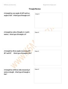 In this classifying triangles worksheet, 10th graders solve 6 different problems related to the classification of triangles either by their angles or by their sides. First, they use a protractor and a ruler to draw triangles using the...