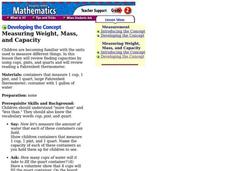 Second graders measure weight, mass, and capacity. In this measurement lesson, 2nd graders model how to measure amounts of liquid by using containers that measure one cup, one pint, and one quart. Students compare the mass of each...
