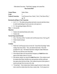 Young scholars complete a Know / Want to Know / Learned chart about India. They locate India on a map and read facts about India. They access the Internet and view a slide show about India. They read "One Grain of Rice" in the Scott...