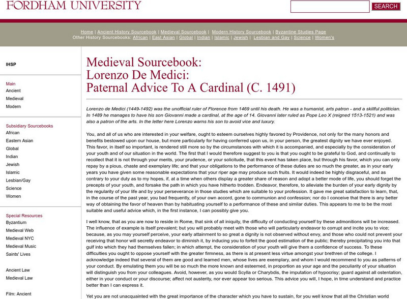 Fordham University: Medieval Sourcebook: Lorenzo De Medici: Paternal Advice to a Cardinal