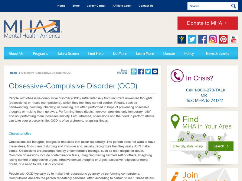 A fact sheet presenting basic information on Obsessive-Compulsive Disorder including characteristics, causes, symptoms, treatments, and co-occurring illnesses.