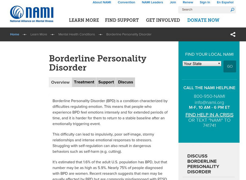 From the National Alliance on Mental Illness, discover the causes, symptoms, co-occurring disorders, and treatment of Borderline Personality Disorder (BPD). Provides links to many outside resources.