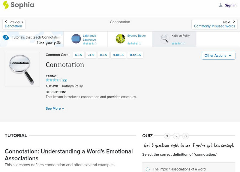 This lesson introduces connotation and provides examples. It is 2 of 3 in the series titled "Connotation."