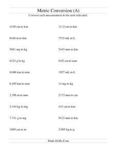 In this metric conversions worksheet, students convert units of measure to each other with meters, kilometers, grams, and more. Students complete 12 problems.