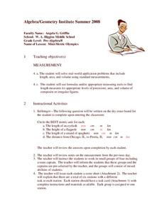 Eighth graders participate in the mini-metric Olympics. In this measurement lesson, 8th graders solve real-world problems that require them to calculate length, area, and volume in metric units.