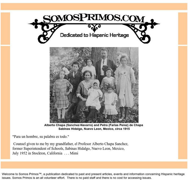 Access is free. Articles explore topics such as Hispanic heritage, the Black/Latino connection, and Hispanic patriots involved in the American revolution. There is a database through which users post surnames they are hoping to trace the...