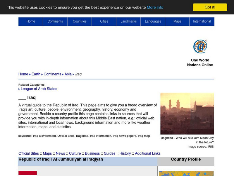 Offers a virtual destination guide and country profile of the Middle East nation of Iraq, background details, and numerous links to key information on the nation's culture, history, geography, economy, environment, population, news,...