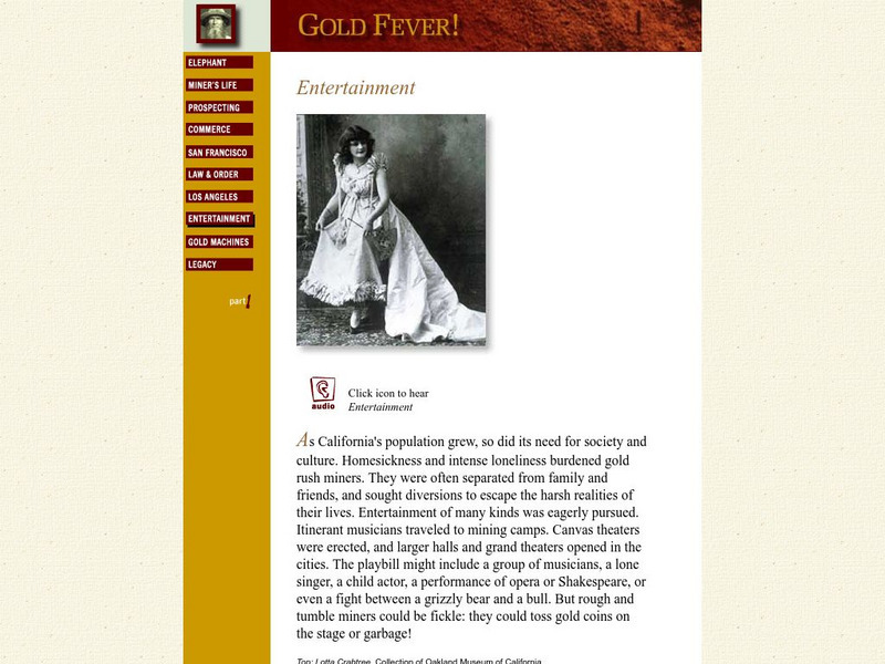 Many individuals made money during the gold rush without finding any gold. This resource dicusses how many actors and musicians made money entertaining lonely miners. There is also an audio version.