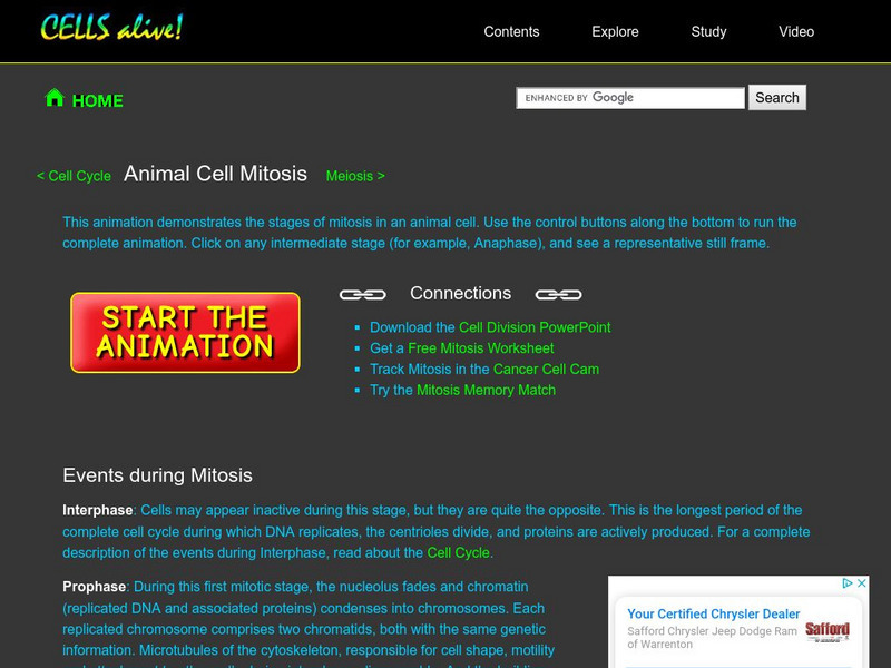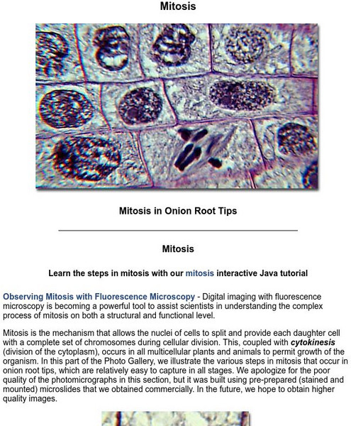 An excellent, concise description of the process of mitosis. There are links to mitosis labs, mitosis movies and other links relating to mitosis.