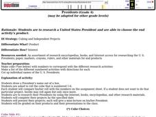 Students conduct a research project. In this United States Presidents lesson, students draw a presidents name out of a box and complete a research activity on their president. Research options include writing a two page paper,...