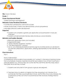 Students participate in mock interviews. In this interview skills lesson, students prepare for a mock interview by following the provided lesson procedures, participate in the evaluated interview, and write Thank You letters to...