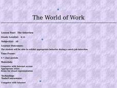 What makes for a successful job interview? Learners explore the topic by viewing a PowerPoint presentation, completing a KWL chart, and answering interview questions with a partner. Then, scholars participate in a mock job interview with...