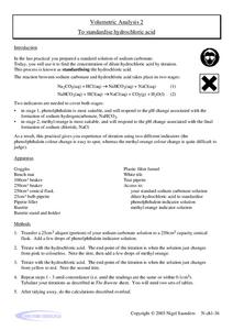 In this volumetric analysis learning exercise, students use a standard solution they made of sodium carbonate to find the concentration of a hydrochloric acid solution by titration. Kids calculate the number of moles of sodium carbonate...