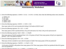 In this stoichiometry worksheet, learners review concepts related to stoichiometry including molar ratio and conservation of matter. Students calculate the number of mole is specific reactions. This worksheet has 7 fill in the blank, 5...