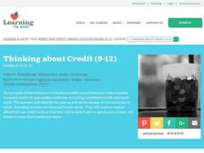 Students explore the concept of credit. In this credit lesson plan, students discuss what it means to buy items using credit. Students discuss how interest accrues and how much is really being paid with a credit card. Students calculate...
