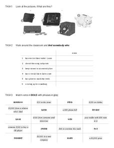 In this money worksheet, learners look at 5 pictures and name each one, walk around the room find somebody that fits 6 scenarios and match 10 verbs in bold print with their appropriate phrases in grey.