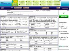 In this online interactive math skills worksheet, learners solve 10 multiple choice math problems that regarding money. Students may view the correct answers.