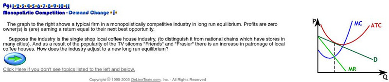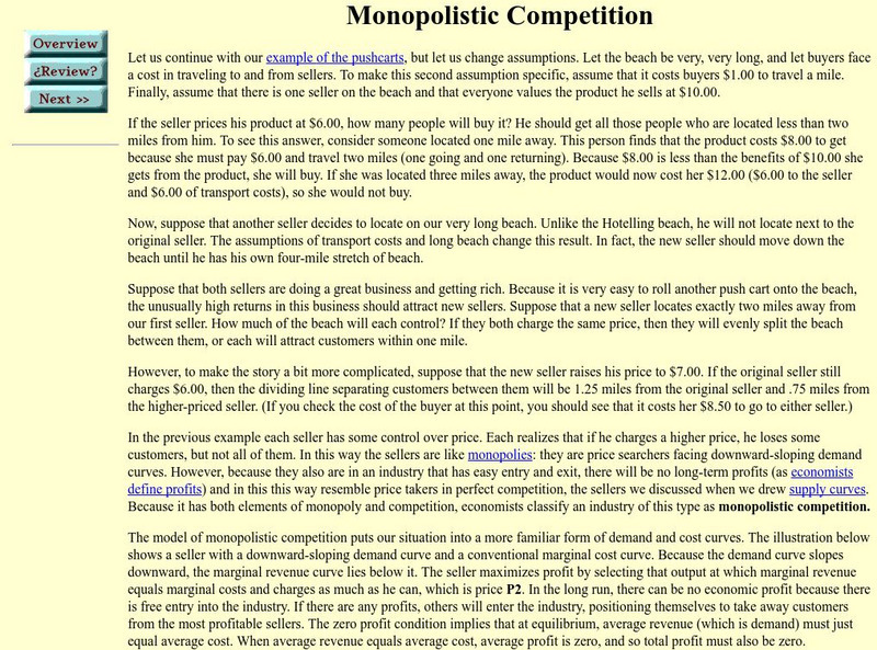 This site provides an in-depth examination of monopolistic competition, along with appropriate levels of output, price, and corresponding profits. This site is for the advanced student of economics.