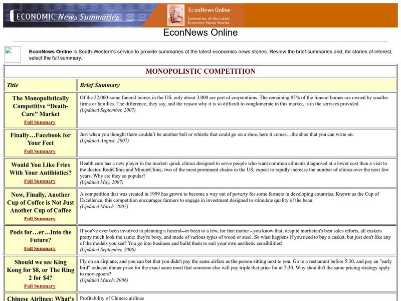 A wide variety of newspaper headlines are provided on the subject of economics and monopolistic competition. Each story comes with its own discussion questions.