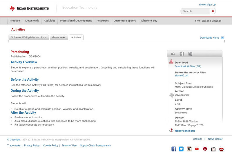 This activity explores a parachutist and her position, velocity and acceleration. Graphing and calculating these functions will be required.