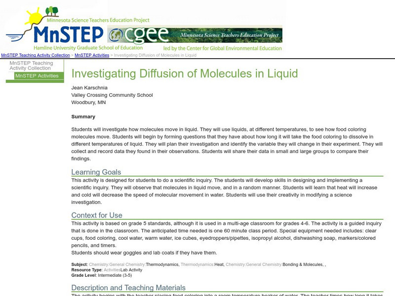 Scientific inquiry activity where students investigate how molecules move in liquid. They will observe that molecules in liquid move in a random manner and that heat will increase and cold will decrease the speed of molecular movement in...