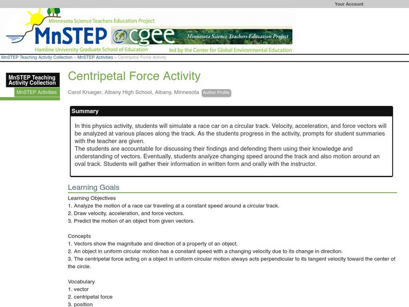 In this physics activity, students will simulate a race car on a circular track. Velocity, acceleration, and force vectors will be analyzed at various places along the track. As the students progress in the activity, prompts for student...
